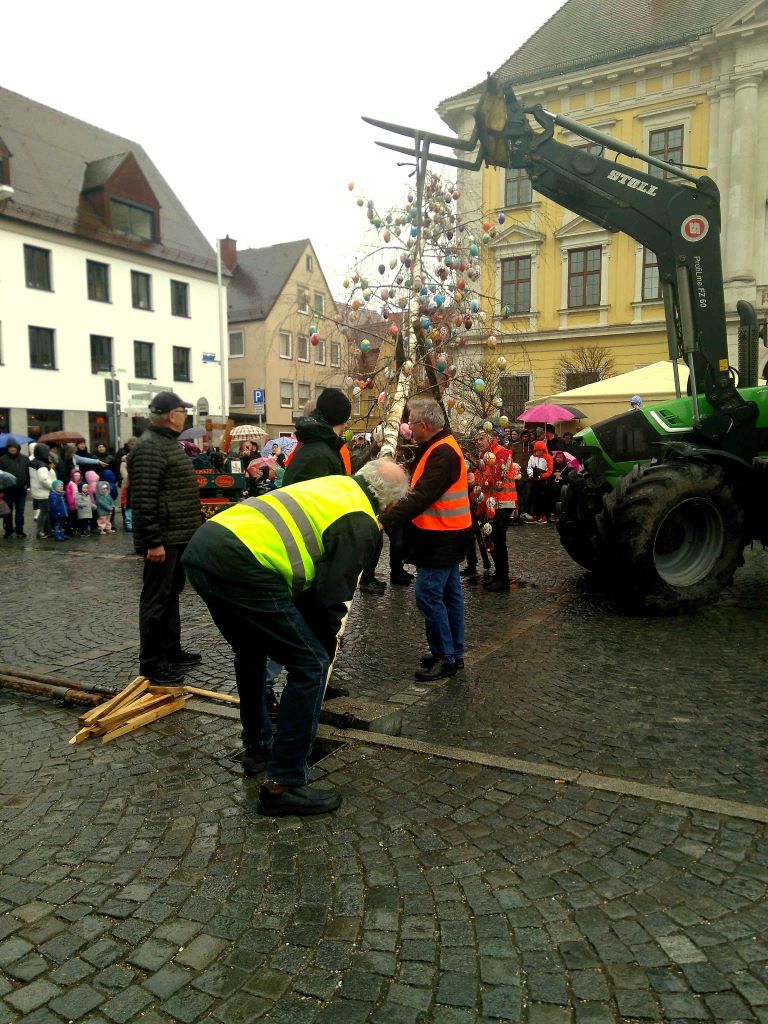 Die Kinder der Lauinger Kindergärten hatten vierhundert Eier bemalt und für einen geschmückten Baum gebastelt. Mit einem historischen Traktor wird der Eierbaum auf den Marktplatz gefahren und dort mit musikalischer Begleitung aufgestellt. Bewirtet werden die Besucher von der Fanfare Brass Band.